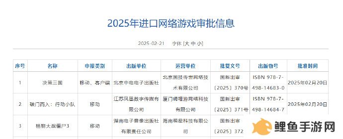 新一批进口网络游戏版号发放,本次共有3款游戏通过审批,《决策三国》《破门而入:行动小队》和《植物大战僵尸3》3款游戏过审。